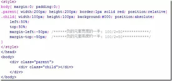 绝对定位进行居中的原理是通过把这个绝对定位元素的left或top的属性设为50%,这个时候元素并不是居中的,而是比居中的位置向右或向左偏了这个元素宽度或高度的一半的距离,所以需要使用一个负的margin-left或margin-top的值来把它拉回到居中的位置,这个负的margin值就取元素宽度或高度的一半。